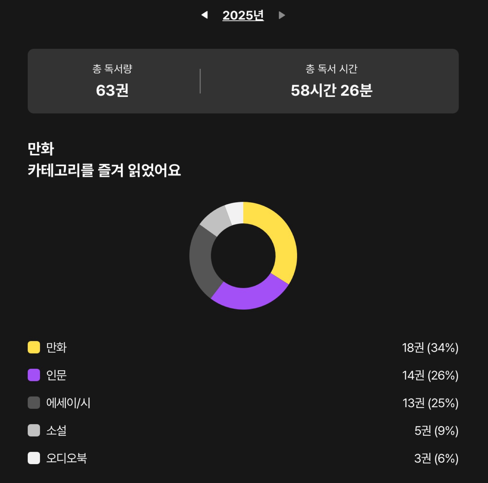 올해 저는 밀리의 서재로 총 63권의 책을 읽었다고 합니다.(34%가 만화책이지만..) 물론 약간 허수가 있는데, 그냥 찍먹한 책도 이 카운트에 들어있는 것 같습니다. 완독한 기준으로 볼 수 있으면 좋을텐데 그렇지는 않은 느낌이었습니다.