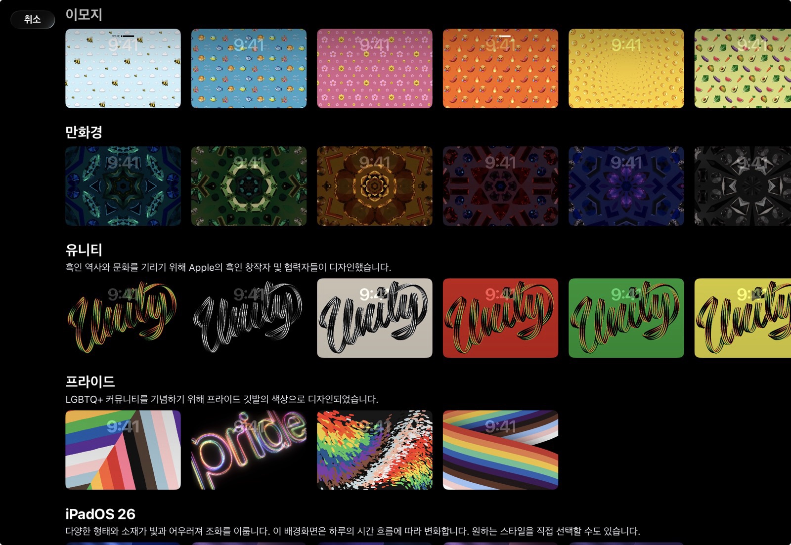 예전보다 선택권이 많아진 것처럼 보이지만 그냥 사진을 배경화면으로 지정하는건 예전보다 더 어려워졌습니다. 여러모로 애플이 제공해주는 기본 배경화면을 사용하는게 제일 잘 어울립니다. 제가 쓰는 아이패드 프로의 기본 배경화면만해도 가로 모드와 세로 모드 모두에서 어울리도록 하려면 애플이 제공해주는대로 써야하죠.