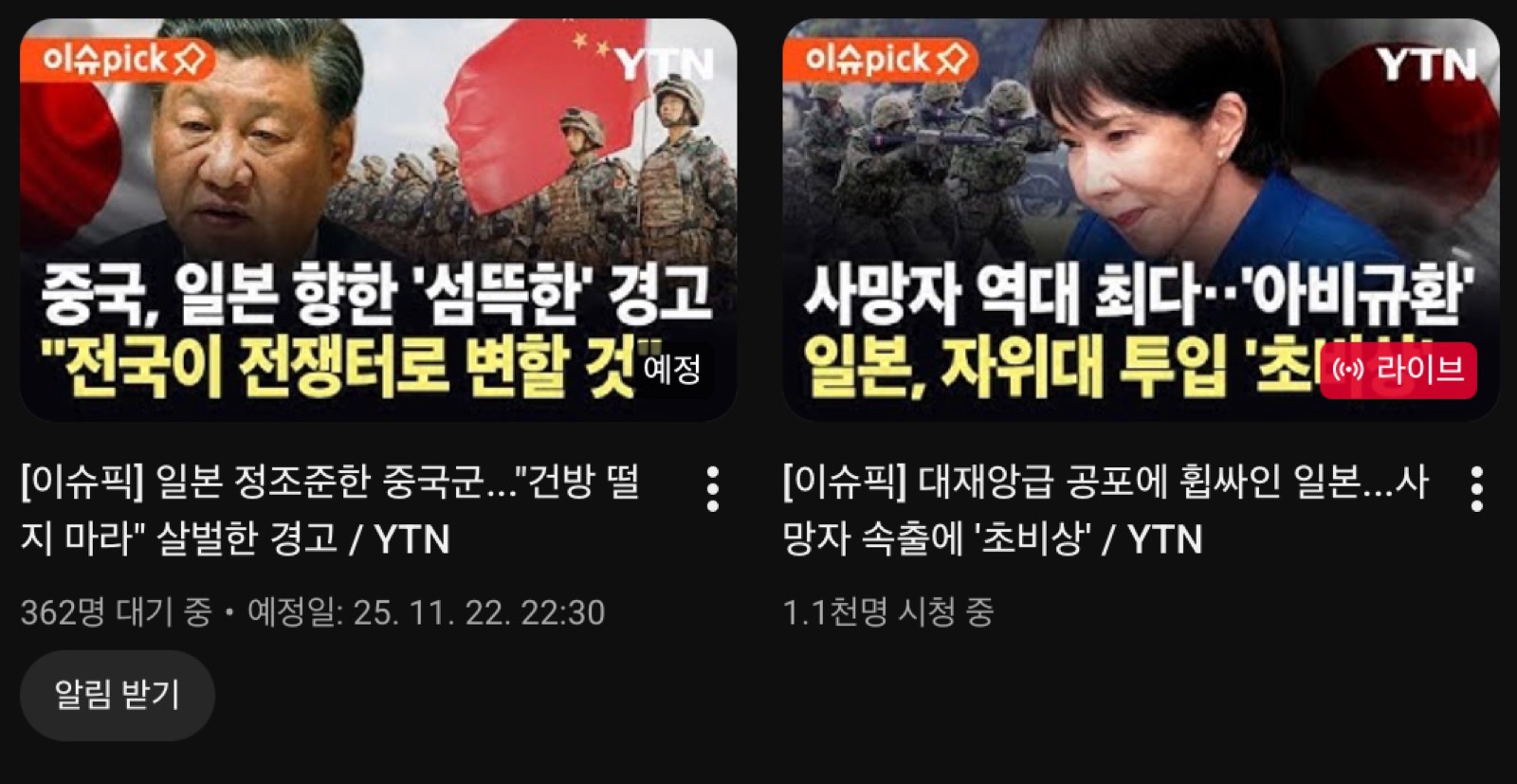 유튜브 YTN 채널의 라이브 썸네일인데 썸네일만 보면 중국과 일본이 전쟁에 돌입한 것 같다.