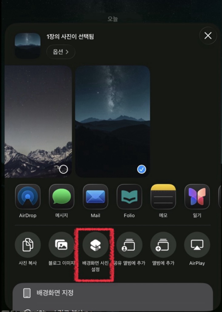 공유시트를 통해 이미지를 설정하고, 배경화면 액션을 통해 원하는 배경화면을 선택해서 지정하는 방식입니다.