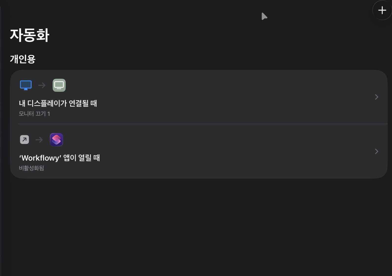 아예 이렇게 단축어를 만들어 놓고 디스플레이 연결시 자동으로 실행되도록 설정해두면 아이패드를 외부 디스플레이에 연결할 때 자동으로 아이패드 쪽 디스플레이가 꺼지도록 설정할 수 있습니다.